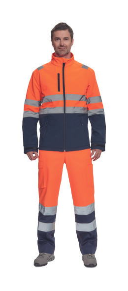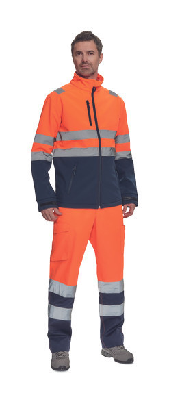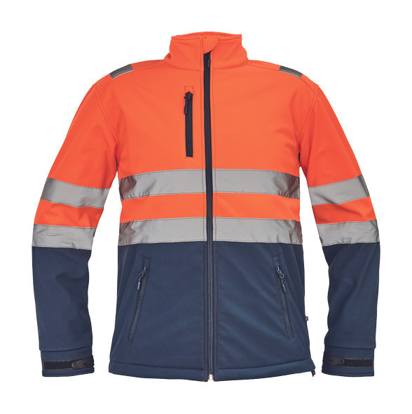 Hi-Vis férfi softshell kabát TPU membránnal; 5cm vastag fényvisszavető csíkok az ujjakon és a testen; cipzáras; 1 mellkasi és 2 oldalsó zseb; tépőzárral szűkíthető ujjvégek, a pulóver alsó részén húzózsinór