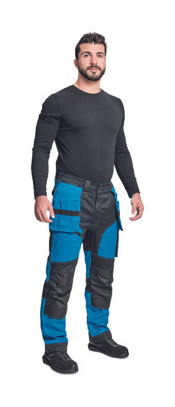 férfi munkanadrág rugalmas derékkal; 2 oldalsó zseb, két szerszámtartó zsebbel elöl; D-gyűrű; 1 oldalsó zseb a lábon hajtókával; 1 oldalsó zseb cipzárral; 2 hátsó hajtókás zseb; megerősített térdrész, térdvédőtartó; 5 cm-rel meghosszabbítható nadrágszárak; a nadrág hátsó, alsó része megerősített; dekoratív varratok; 265 g/m2ű
