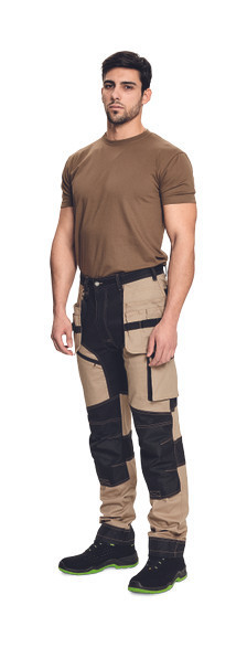 férfi munkanadrág rugalmas derékkal; 2 oldalsó zseb, két szerszámtartó zsebbel elöl; D-gyűrű; 1 oldalsó zseb a lábon hajtókával; 1 oldalsó zseb cipzárral; 2 hátsó hajtókás zseb; megerősített térdrész, térdvédőtartó; 5 cm-rel meghosszabbítható nadrágszárak; a nadrág hátsó, alsó része megerősített; dekoratív varratok; 265 g/m2ű