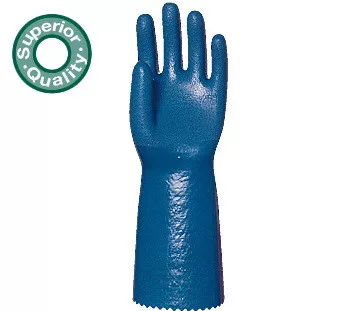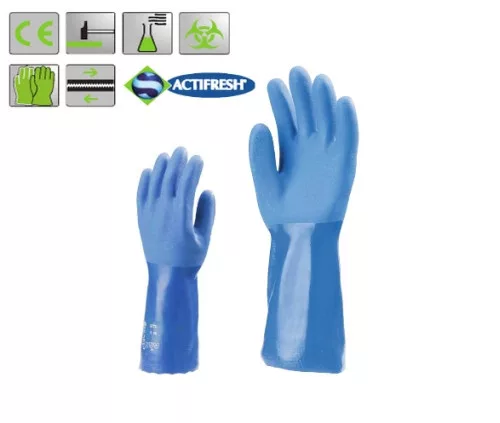 Érdesített PVC védőkesztyű, 34 cm-es, kék, sav-, lúg-, olajálló, antibakteriális Actifresh- kiképzéssel