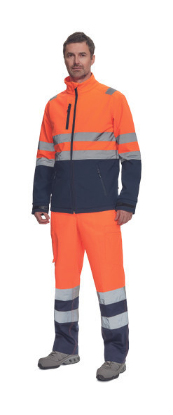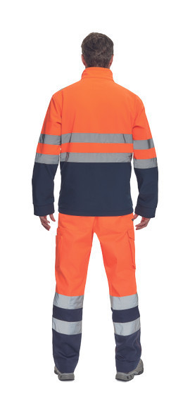 Hi-Vis férfi softshell kabát TPU membránnal; 5cm vastag fényvisszavető csíkok az ujjakon és a testen; cipzáras; 1 mellkasi és 2 oldalsó zseb; tépőzárral szűkíthető ujjvégek, a pulóver alsó részén húzózsinór