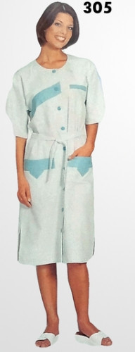 Női köpeny HT305, O nyakú, elől gombos, gallér nélküli, rövid ujjú, hosszú fazonú modell 3 zsebbel.