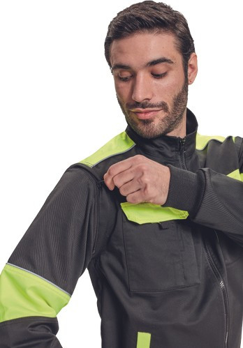 férfi cipzáras munkakabát levehető ujjakkal; 2 első zseb, 2 mellzseb; Oxford 600D erősítés a váll és könyök részeken; rugalmas mandzsetta és alsó derékszegély; fényvisszavető szegés